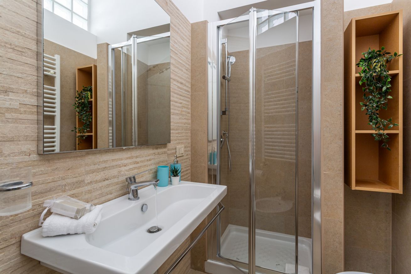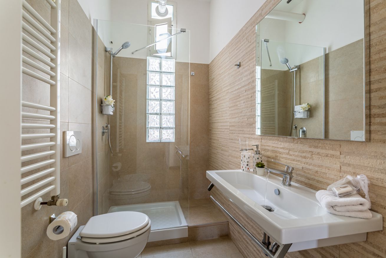 The apartment opens onto an entrance hallway leading to two spacious double bedrooms, each equipped with a TV. There are two modern, fully equipped bathrooms, as well as a fully stocked kitchen perfect for preparing meals independently. The welcoming dining room offers a comfortable space to relax and enjoy time together after a day exploring Rome. The accommodation is designed to provide comfort and practicality for families, couples, and groups.