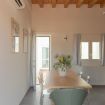 The living area features an entrance that opens onto a cozy living room with a sofa bed, a spacious kitchen, and a large terrace, which is perfect for enjoying outdoor meals with a view.