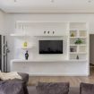 The entrance opens onto a spacious and bright living area, featuring a comfortable lounge with sofa and TV, as well as a generous dining space.
