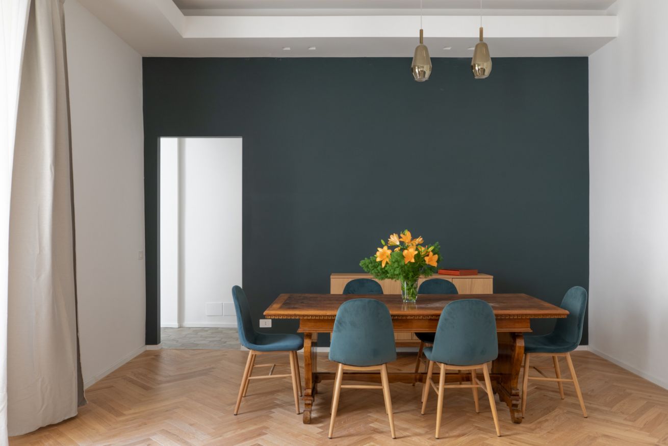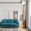 The apartment is located on the fourth floor of a historic and elegant building with an elevator, which can be reached by climbing a flight of stairs.
