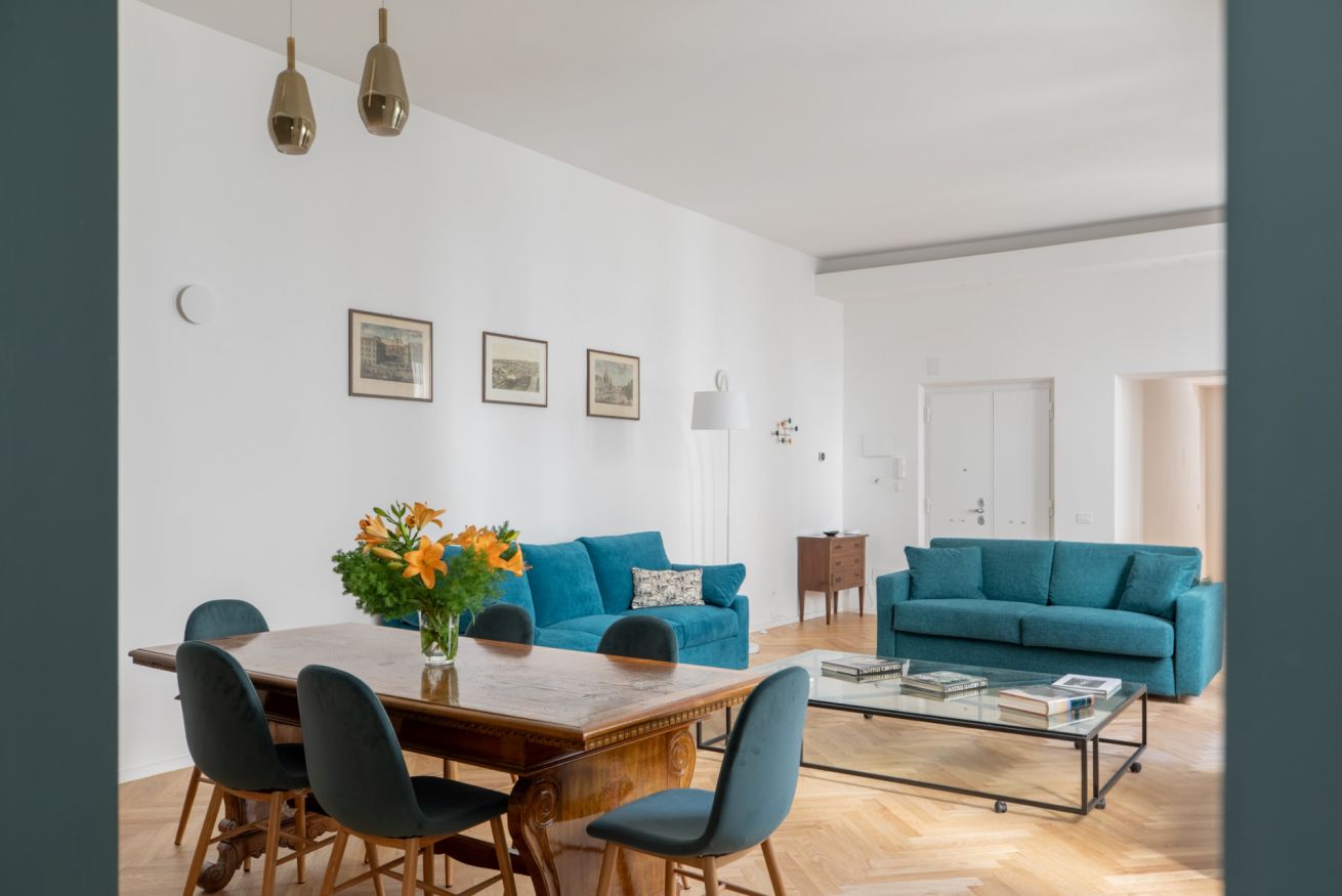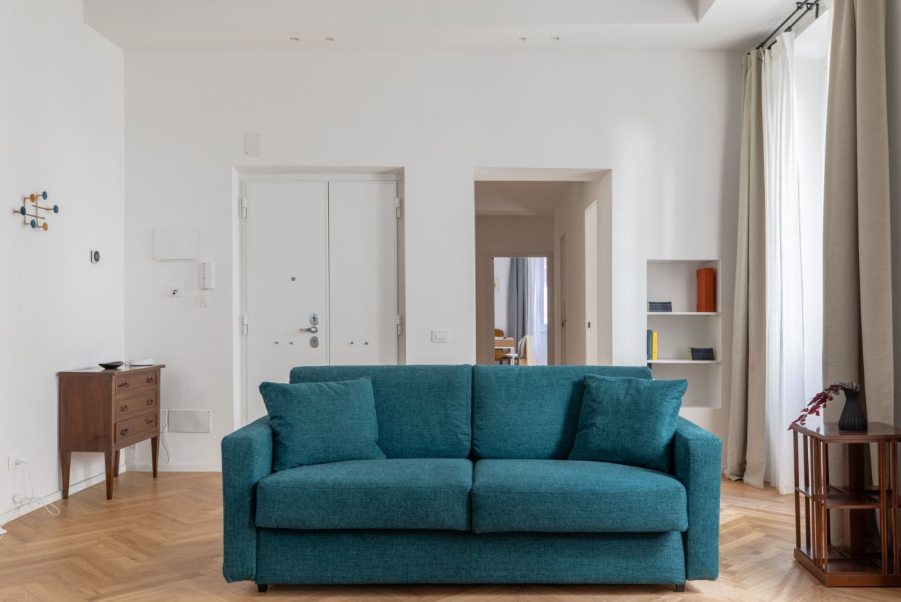 Upon entering, you are welcomed by a spacious hallway that leads directly to the living room, bright and furnished with new, carefully selected furniture, and a comfortable duble sofa bed.