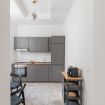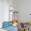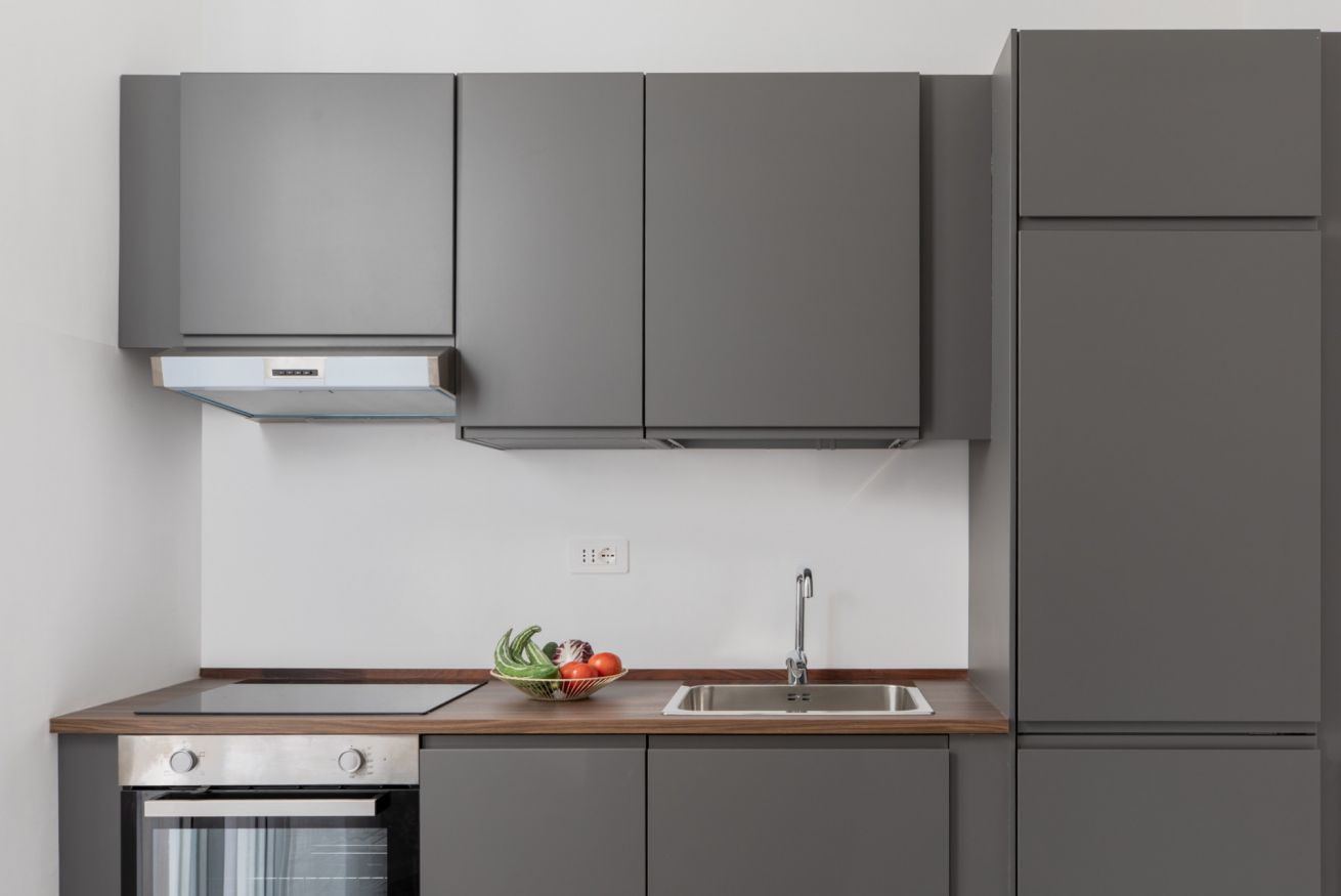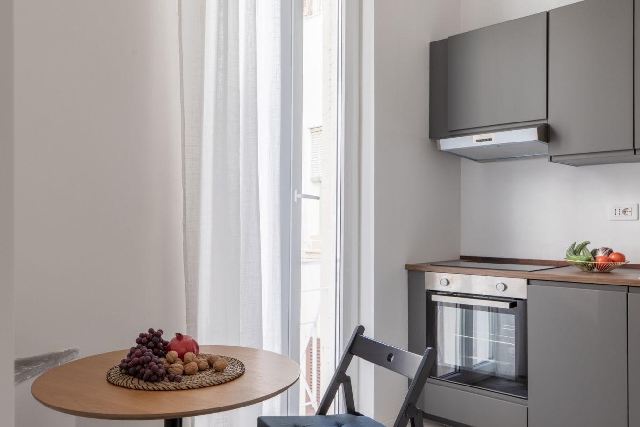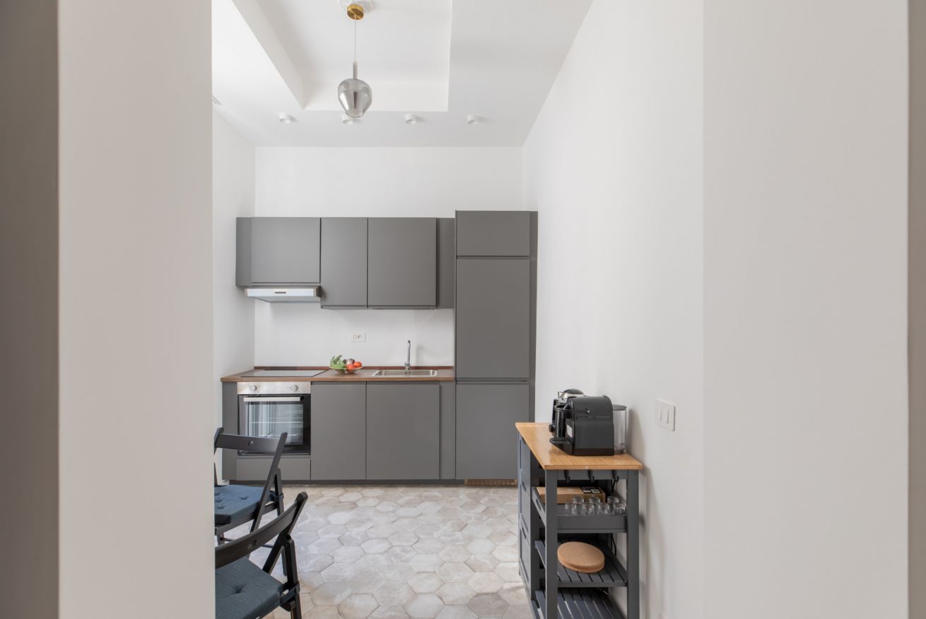 The kitchen, compact yet highly functional, is fully equipped with everything you need to cook comfortably. The living area is completed by a storage closet with a washing machine and extra space for storing belongings.