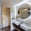 The house has two bathrooms inside, one with a large shower, the other with a whirlpool tub. In both, the marbles chosen are fine and unique.