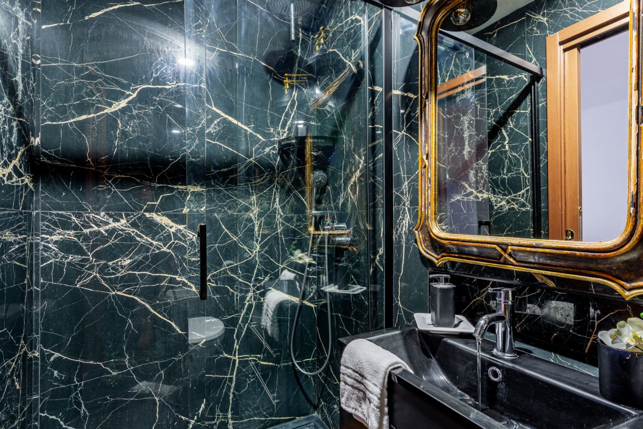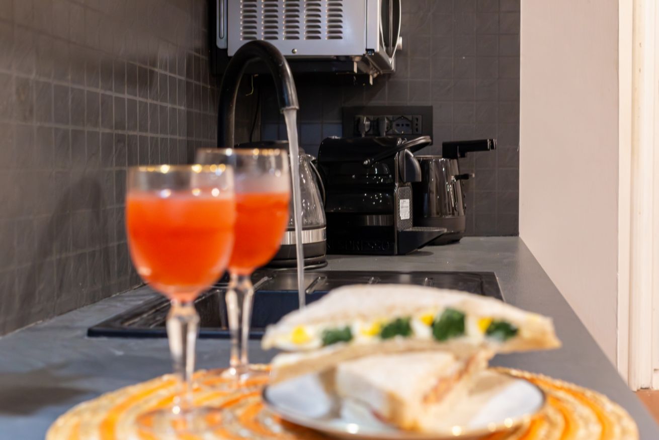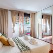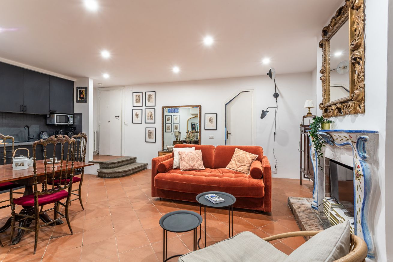 Located on the ground floor, this elegant apartment combines modern comfort with historic charm. The entrance opens onto a bright living area with a fully equipped kitchenette and a comfortable sofa bed, perfect for relaxing or accommodating extra guests.