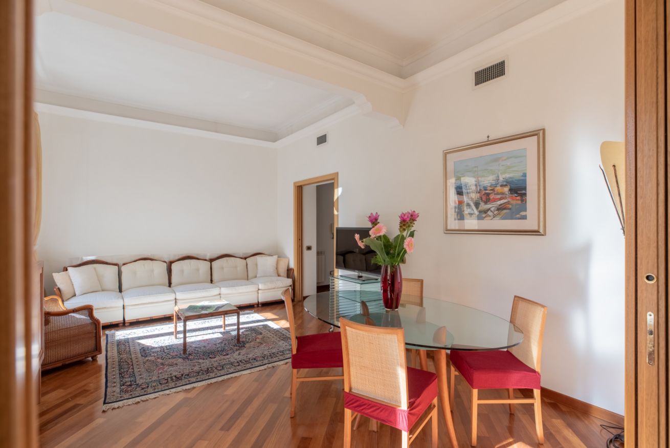 The apartment is located on the third floor of an elegant building with an elevator, in the heart of the Repubblica area. It features two double bedrooms, a spacious living room with a sofa and dining table, a fully equipped kitchen, and two full bathrooms, one of which is en suite. The apartment is provided with all the necessary amenities to ensure a comfortable and high-quality stay.